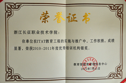 在暑期召开的全国信息技术应用培训教育工程年度工作会议上,由于在ITAT教育工程的实施与推广中,我院工作积极,成绩显著,获得全国ITAT教育工程2010-2011年度优秀培训机构银奖,受到了教育部教育信息管理中心的表彰,学院也被授予全国ITAT教育工程2010-2011年度优秀培训基地称号。王映波等两名同志被评为2010-2011年度全国ITAT教育工程先进工作者。
