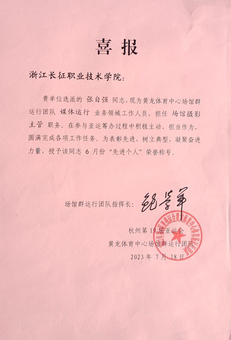 学院基础部教师张自强积极发挥党员的先锋模范作用,作为杭州第19届亚运会黄龙竞赛场馆媒体运行领域主管,在3个多月的筹备和16天的亚运正赛期间,所在的黄龙竞赛场馆群媒体运行领域,接待和服务了来自世界各地500多家媒体,6000多名记者的采访和报道,见证了22枚亚运金牌的诞生。他本人凭借优异表现,获得了亚组委黄龙媒体运行团队“先进个人”的荣誉称号,所带领的团队得到了包括新华社、英国路透社、日本共同社、新加坡联合早报等媒体记者们的肯定和赞赏。
