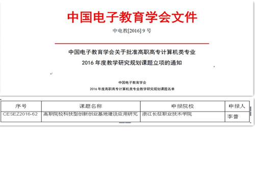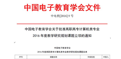 根据 中国电子教育学会高职高专计算机类专业2016年度教学研究规划课题立项的通知精神,我院根据实际教学情况, 积极推动教学研究工作, 组织开展教师积极申报课题,力争能在高职高专计算机类专业教学改革方面有所突破,使研究成果对全国其他高职高专院校的计算机类专业建设其示范作用。